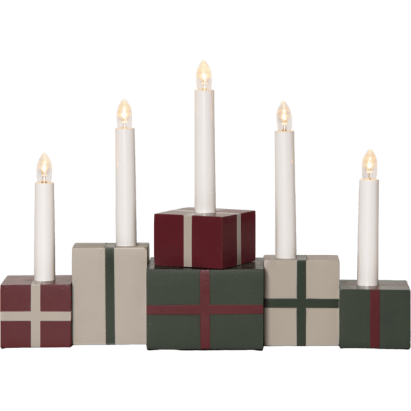 Julegaver i fine farger som hører julen til. Lysestaken er fin fra alle vinkler og skaper en koselig følelse. Plasser den på et skjenk eller i vinduet ditt. Leveres med en 1,8 m hvit ledning, strømbryter og støpsel. 5 utskiftbare E10 LED-pærer inkludert.