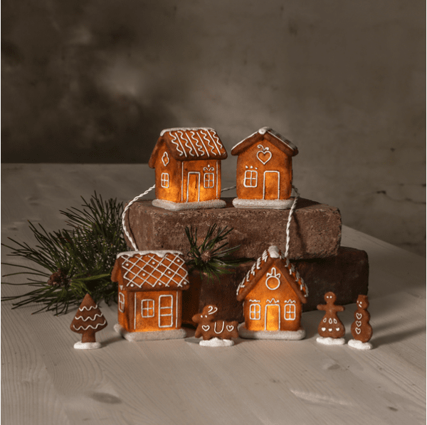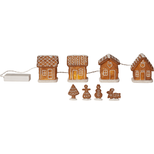 Dekorasjonssett med 8 deler, perfekt til juledekorasjon. Settet består av 4 små pepperkakehus med 4 pepperkakefigurer. Husene lyser fint opp når produktet er på. Plasser på et bord eller en hylle for en herlig julestemning. Drevet av 2 AA-batterier (ikke inkludert). Leveres med 25 cm ekstra kabel fra batteriboksen til det første pepperkakehuset. Brennetid ca.: 75 timer.