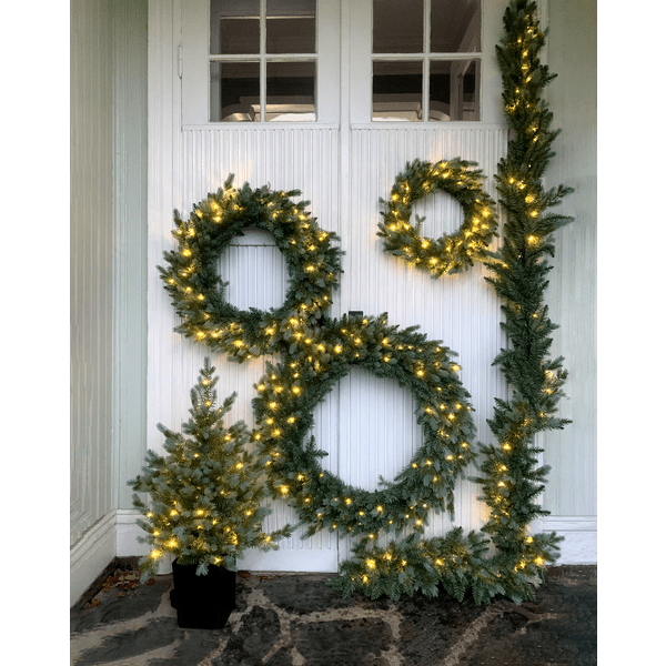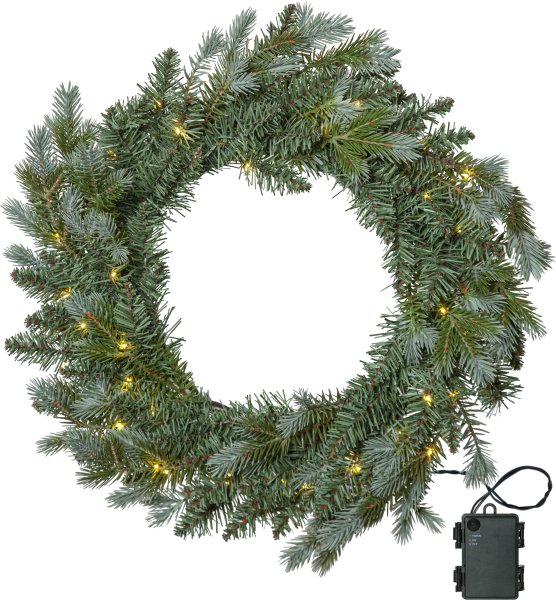 Greyland-kransen er ca. 55 cm i diameter. Den er laget av en blanding av PE-spisser og PVC-spisser med et vakkert grønt-grønt skimrende utseende. Med 40 små varmhvite lyspunkter lyser den vakkert både innendørs og utendørs. Sløyfen kan enten lyse konstant eller stilles inn med en timer som lyser i 6 timer og er av i 18 timer før den slås på igjen dagen etter. Den drives av 3 AA-batterier, de er ikke inkludert. I samme familie er det äselv graner, flere størrelser av å kranser og en krans.