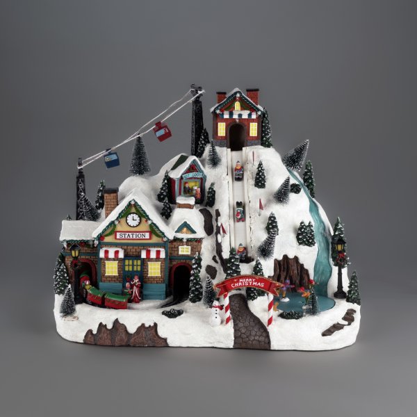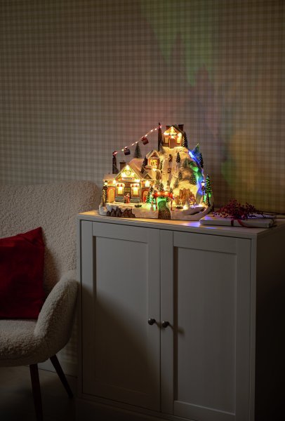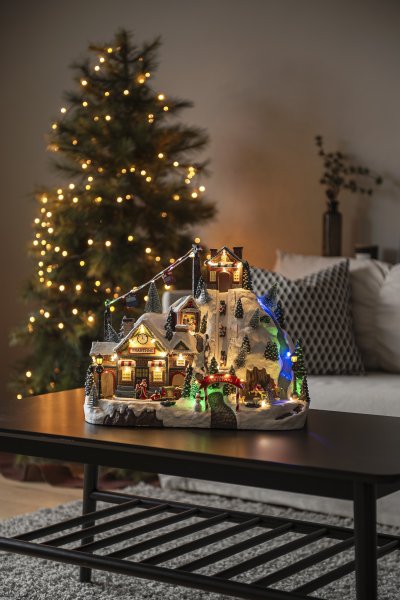 Skap en livlig og magisk julefølelse med denne detaljerte julelandsbyen formet som et skianlegg, laget av polyresin. Det snødekte miljøet med stasjon, skibakke og heis sprer en flott vinterstemning. Totalt 42 LED-dioder lyser opp landsbyen i forskjellige farger og skaper en stemningsfull glød, samtidig som de spiller musikk for en ekstra festlig opplevelse. Julelandsbyen drives av 3 AA-batterier (ikke inkludert) og leveres også med en USB-kabel for bruk med ledning (transformator ikke inkludert).