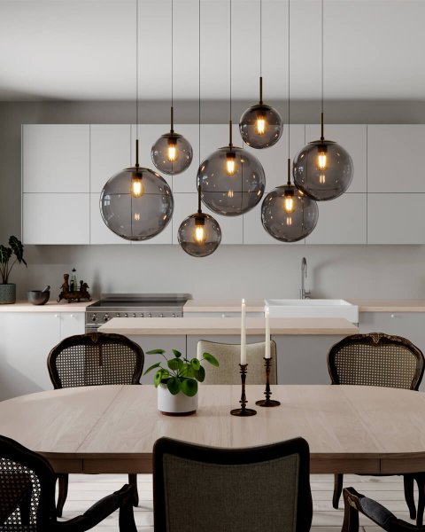 Oppdag taklampen Laura, en imponerende kombinasjon av moderne design og klassisk eleganse. Denne lampen er laget av matt svart metall med stilige messingdetaljer, og utstråler en tidløs sjarm. Den er utstyrt med sju lysegrå glasskupler i forskjellige størrelser, som enkelt monteres for å skape en harmonisk lyseffekt. De svarte justerbare tekstilkablene gir ikke bare en praktisk funksjon, men bidrar også til lampens sofistikerte estetikk. Laura er spesielt egnet for større rom der den tar opp plass og fungerer som et sentralt dekorativt element. Det eksklusive utseendet og den robuste konstruksjonen gjør den til et utmerket valg for de som verdsetter både stil og funksjon. Med Laura får du ikke bare en lyskilde, men også et designuttrykk som forsterker atmosfæren i hele rommet. Denne taklampen er ideell for både moderne og tradisjonelle interiørstiler, og tilbyr en perfekt balanse mellom form og funksjon, noe som gjør den til et uunnværlig tillegg til hjemmet ditt. Lengden på takfestet er 86 cm. Lyskilder er ikke inkludert.
