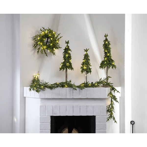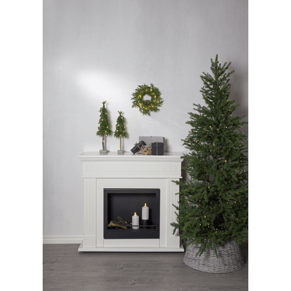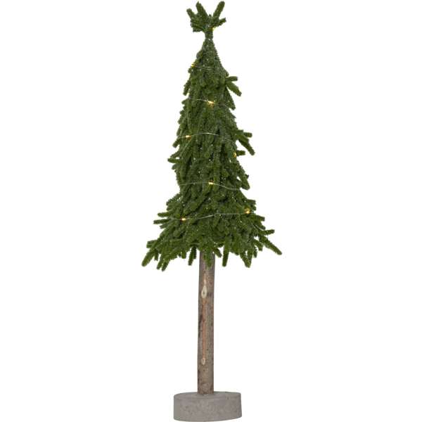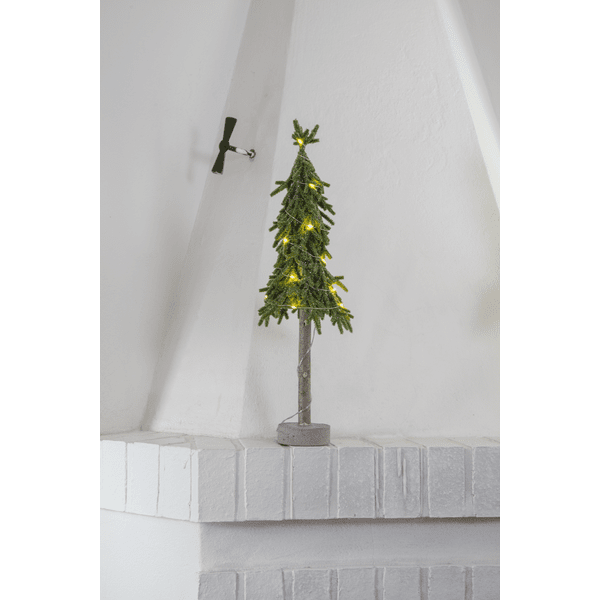 Dekorativt, mindre bordgrantre i PE-materiale med litt glitter og en stabil base av sement. Treet lyser opp med sine 15 små varmhvite LED-dioder. Plasser det på sidebordet, under treet eller på spisebordet som dekorasjon når du dekker bordet. Leveres med en 30 cm ledning til batteriboksen. Treet drives av 2 AA-batterier, ikke inkludert. Brennetid ca.: 200 timer.