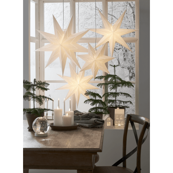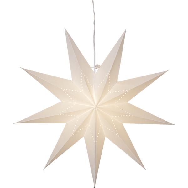 Hvit papirstjerne med stjerneformet perlemønster. Pynt med til jul og advent. Heng en eller flere stjerner sammen i et vindu eller mot en vegg. Leveres med en 3,5 m hvit ledning og støpsel. Lyskilde er ikke inkludert.