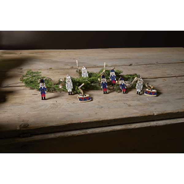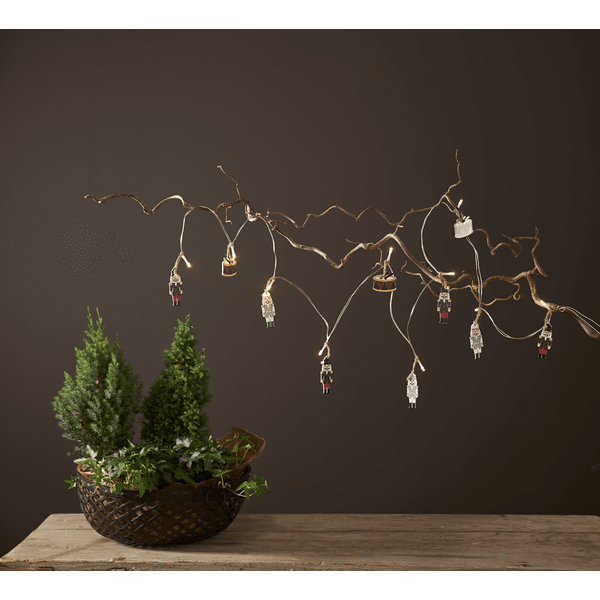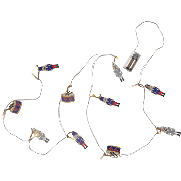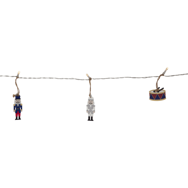 Lyslenke for innendørs bruk dekorert med 10 trefigurer i fargene blå/grå/hvit og rød. Figurene er bundet med hampsnor. Dekorativ dekor som gir en koselig glød i hjemmet. Utstyrt med timer, 6 timer på, 18 timer av, repeterende. Drives av 2 AA-batterier, ikke inkludert. Leveres med 30 cm ekstra ledning fra batteriboks til første figur.