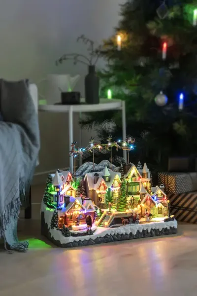 Fantastisk julelandsby med bevegelige deler, fargerike tog og 52 strålende LED-lys som lyser opp hver eneste detalj. Julenissens slede flyter over landsbyen mens julemusikk spiller og skaper en magisk atmosfære. Perfekt som et imponerende blikkfang i hjemmet i julen. En komplett juleverden full av liv, lys og bevegelse. Brennetid opptil 8 timer. Drives av 3xAA-batterier (1,5V), batterier er ikke inkludert. Transformator inkludert med 1,8 m sort USB-kabel og plugg.