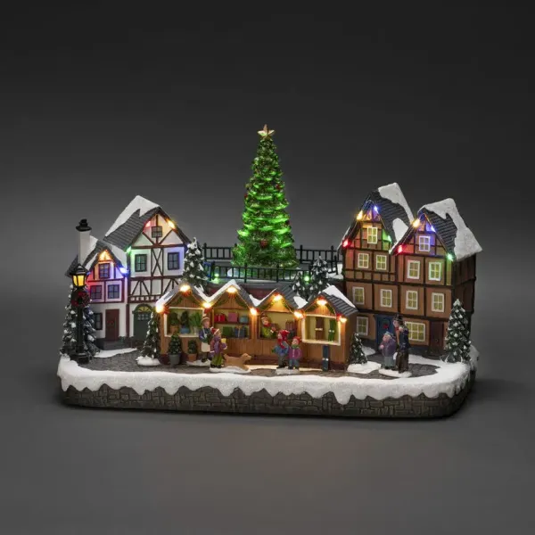 Skap et levende vinterland i hjemmet ditt med dette mekaniske julemarkedet! Med 28 varmhvite LED-lys, overbygde hus, fargerike markedsboder og et digert juletre i sentrum, sprer det både lys og musikk. En stemningsfull dekorasjon som leder tankene hen på klassisk julemagi! Drevet av 3xAA-batterier (1,5V – ikke inkludert). Transformator følger med 1,8m sort ledning og plugg. Integrert LED-belysning.