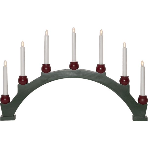 Grønn adventslysestake med fin bueform. Fem LED-lys utsmykket med røde holdere skaper en koselig glød og gir en tradisjonell lyseffekt. La julevarmen spre seg i vinduet med denne klassiske lysestaken. Plasser den i vinduet eller på skjenken. Leveres med en 1,8 m hvit ledning, strømbryter og støpsel. Inkluderer 7 utskiftbare E10 LED-pærer.