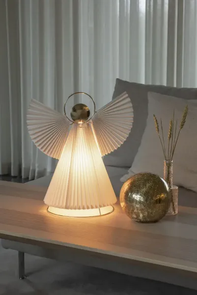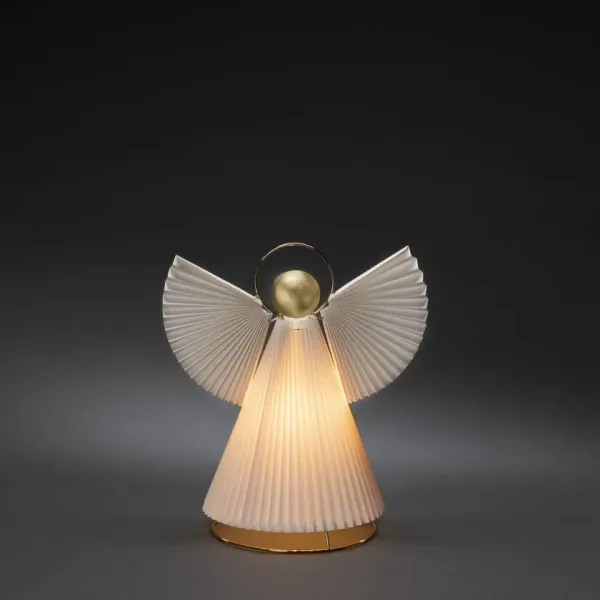 Stilig papirengel med plisserte detaljer og gullhode – en vakker dekorasjon som passer perfekt i vinduer eller på vegger; bordet. Skaper en rolig og varm atmosfære i hjemmet i advent og jul. Enkel å plassere og en elegant kontrast til tradisjonell juledekor. En tidsfavoritt år etter år. Leveres med 5m hvit ledning, strømbryter og støpsel. Lys er ikke inkludert.