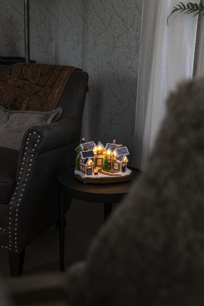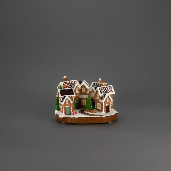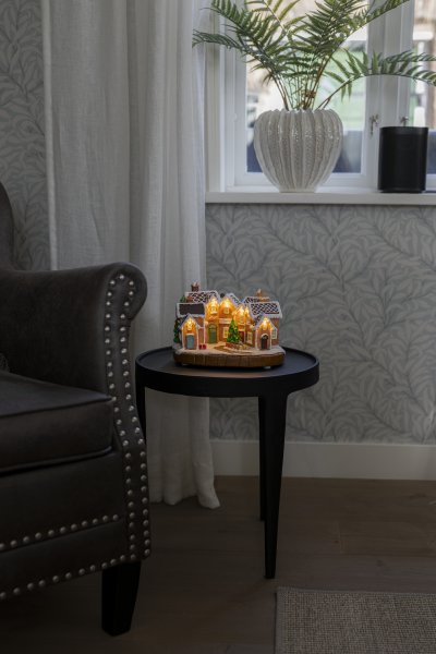Skap en koselig og leken julestemning med denne detaljerte pepperkakelandsbyen i polyresin. De snødekte takene, fargerike dørene og det dekorerte juletreet i midten gir følelsen av et eventyrlig julemiljø. De varmhvite LED-lysene lyser opp husene og skaper en hjemmekoselig glød. Pepperkakelandsbyen drives av 3 AA-batterier (ikke inkludert) og kan også kobles til med den medfølgende USB-kabelen for bruk med ledning (transformator ikke inkludert). Perfekt som en stemningsfull dekorasjon i hjemmet i julen.